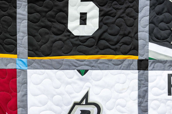 Tailored corner-stoning choices for each blanket, seamlessly blending borders and binding together with your choice of extra jersey materials (Team logo patch, arm #'s, etc.) for a personalized touch.